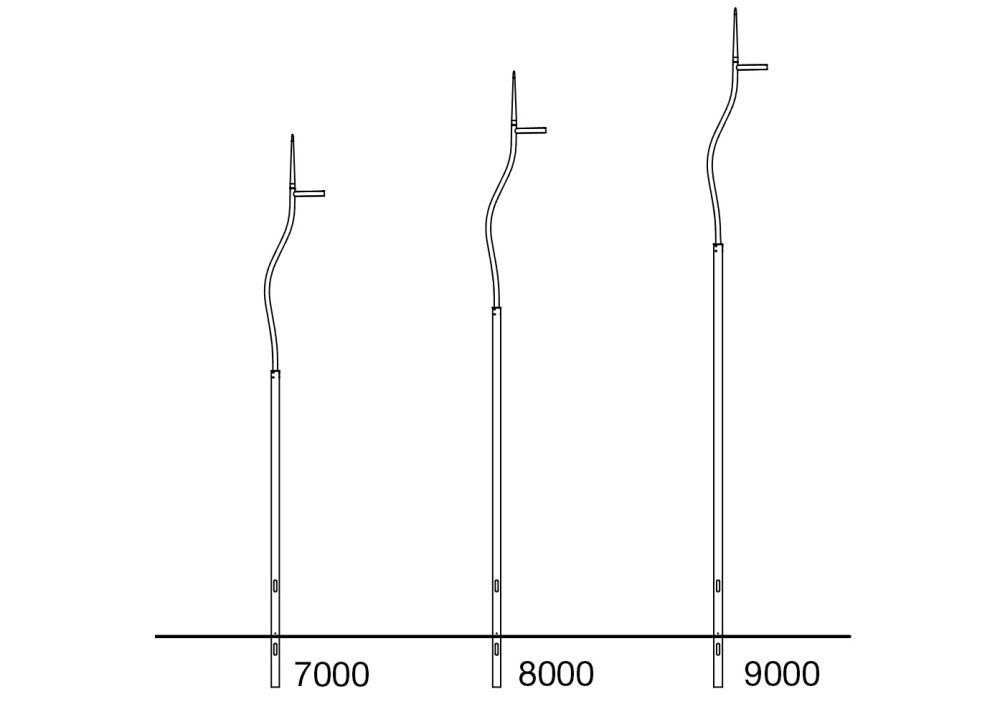 Palo in acciaio a sezione circolare composto da due tratti assemblabili con sbraccio Ø76 e codolo Ø60 opzionale. Parte finale conica. Asola ingresso cavi e asola per morsettiera con finitura del bordi del taglio idonea anche per l’applicazione di portella incassata a filo palo.